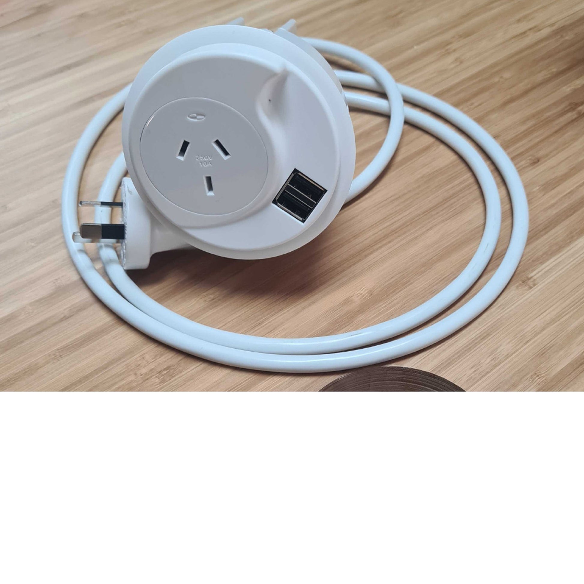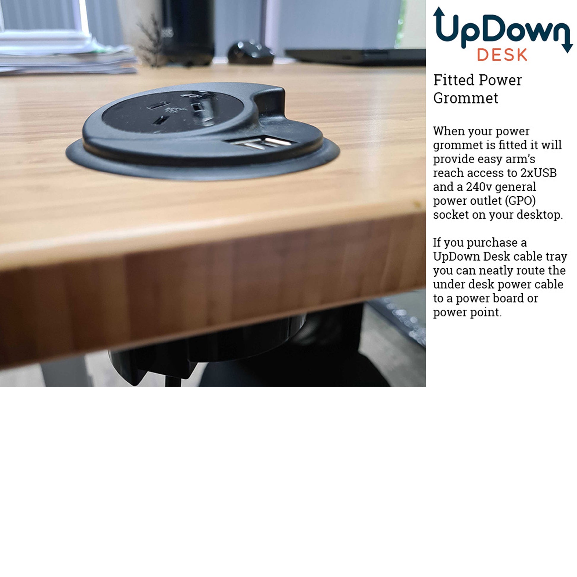 The UpDown Desk power grommet is a neat and compact way to provide USB (2 plugs) and 240v Australian Power Outlet (GPO) right on top of your desktop within arms reach. No more crawling around under the desk trying to locate power connections! Enjoy a more organised workstation and power everything right from your desktop. As with all products from UpDown Desk, you will be pleasantly surprised by the build quality.