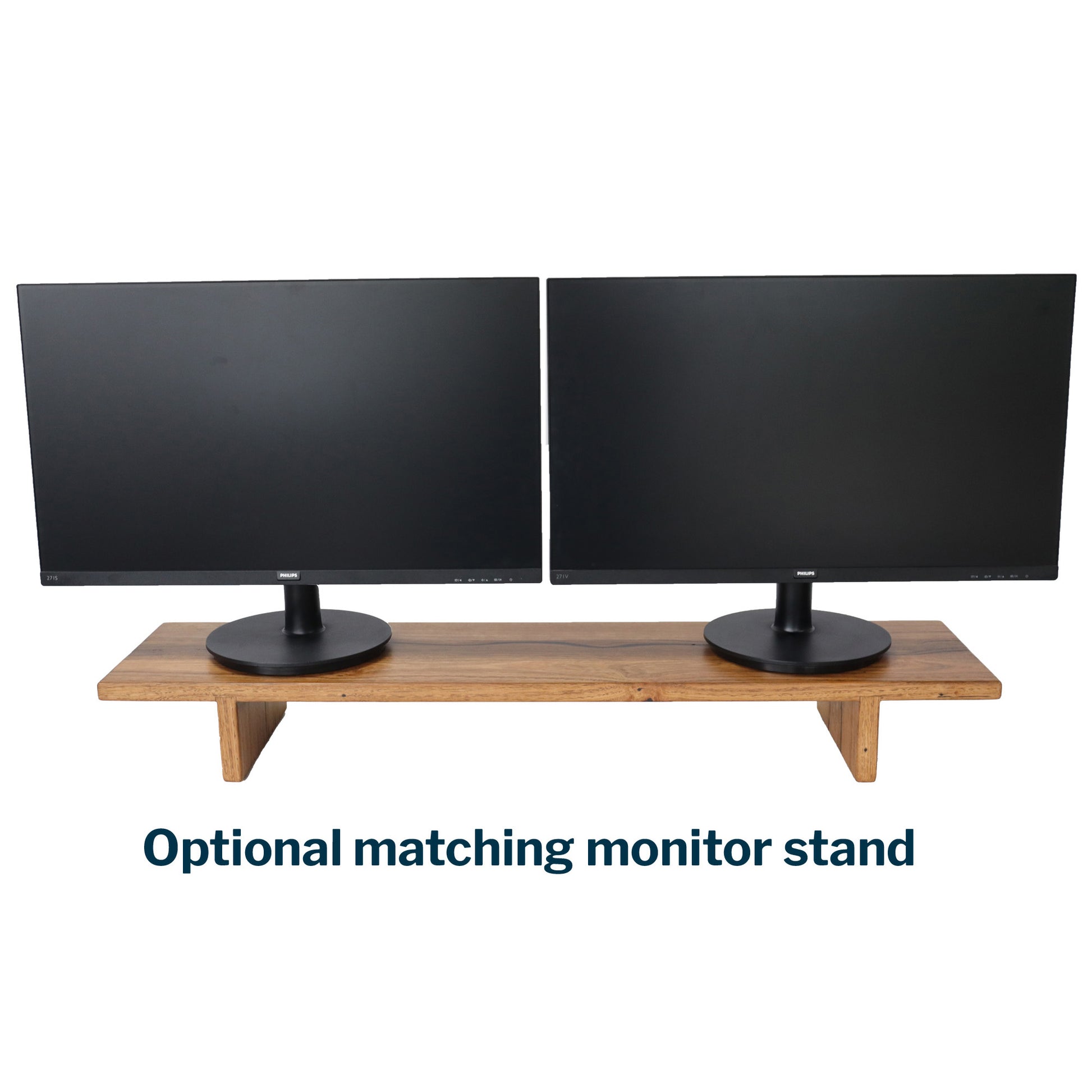 Our Recycled Messmate desktop is an eye-catching desk full of character and handmade by our local artisan furniture maker. Constructed from reclaimed local timber, each desktop offers unique grain patterns and characteristics for people interested in beauty as well as function and environmental sustainability. It comes in either a Natural light finish, or a darker Black Japan stain. This solid wood desktop is a generous 27mm thick with a pencil bullnose edge type and a square corner. It features reinforced bars on the underside of the desktop for additional strength.