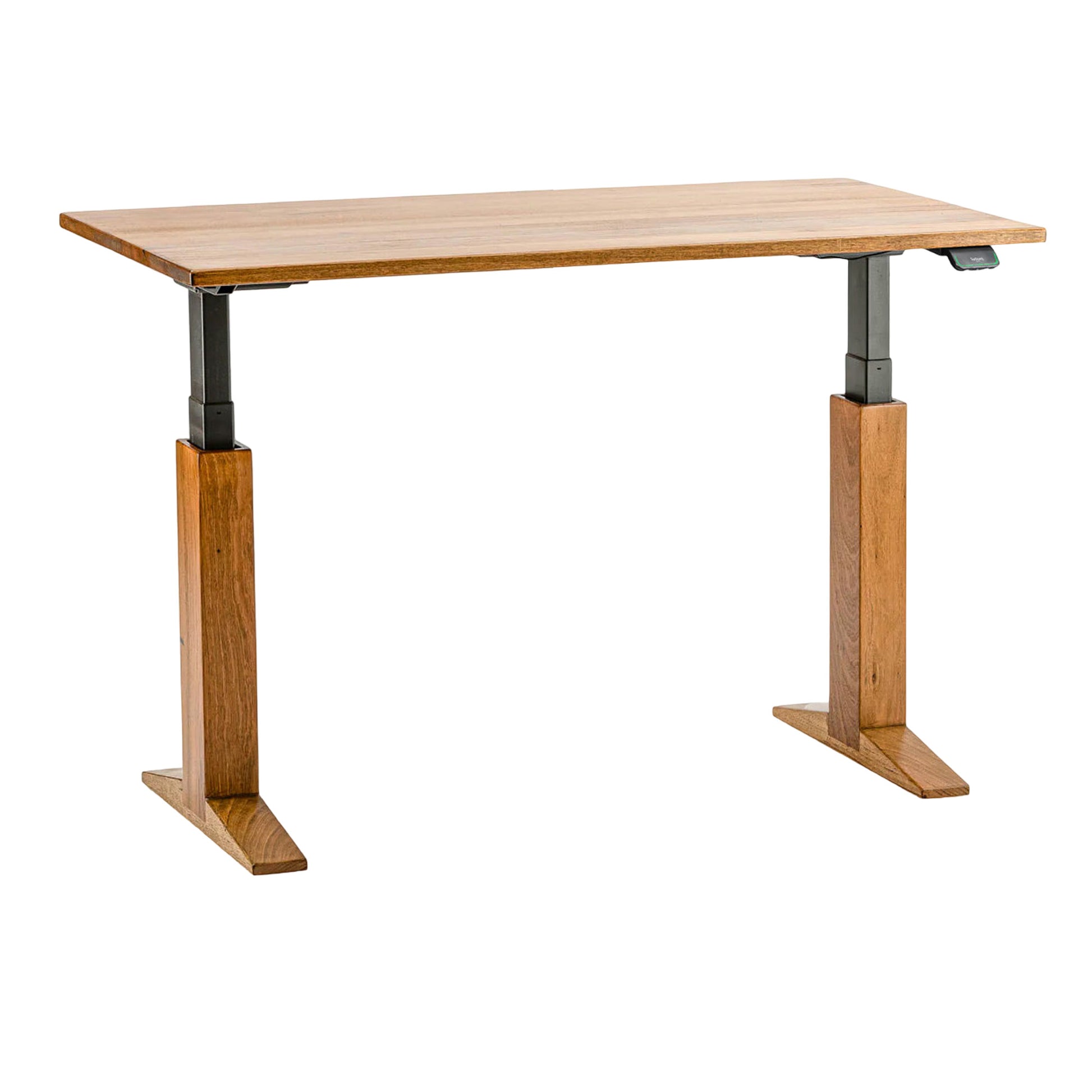 The Ultimo Standing Desk is an eye-catching desk full of character and handmade by our local artisan furniture maker. They feature an ingenious design with timber legs and feet encasing the steel lifting mechanism. Constructed from reclaimed local timber, each desktop offers unique grain patterns and characteristics. This solid wood desktop is a generous 27mm thick with a pencil bullnose edge type and a square corner. It features reinforced bars on the underside of the desktop for additional strength.