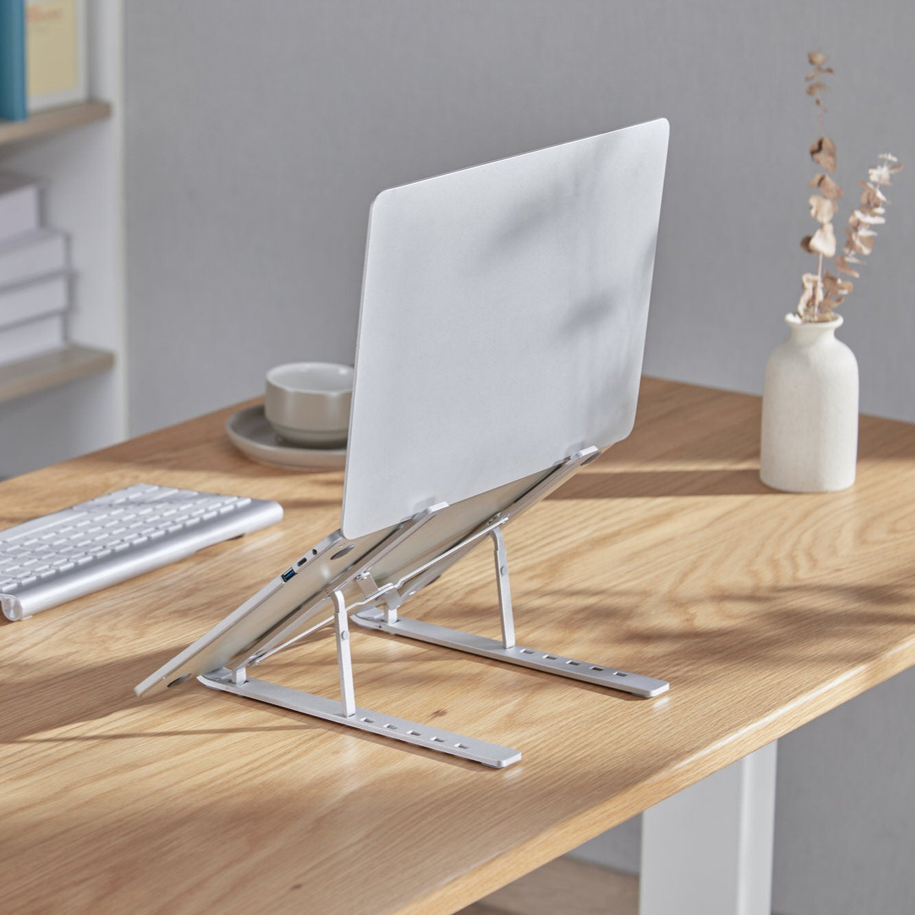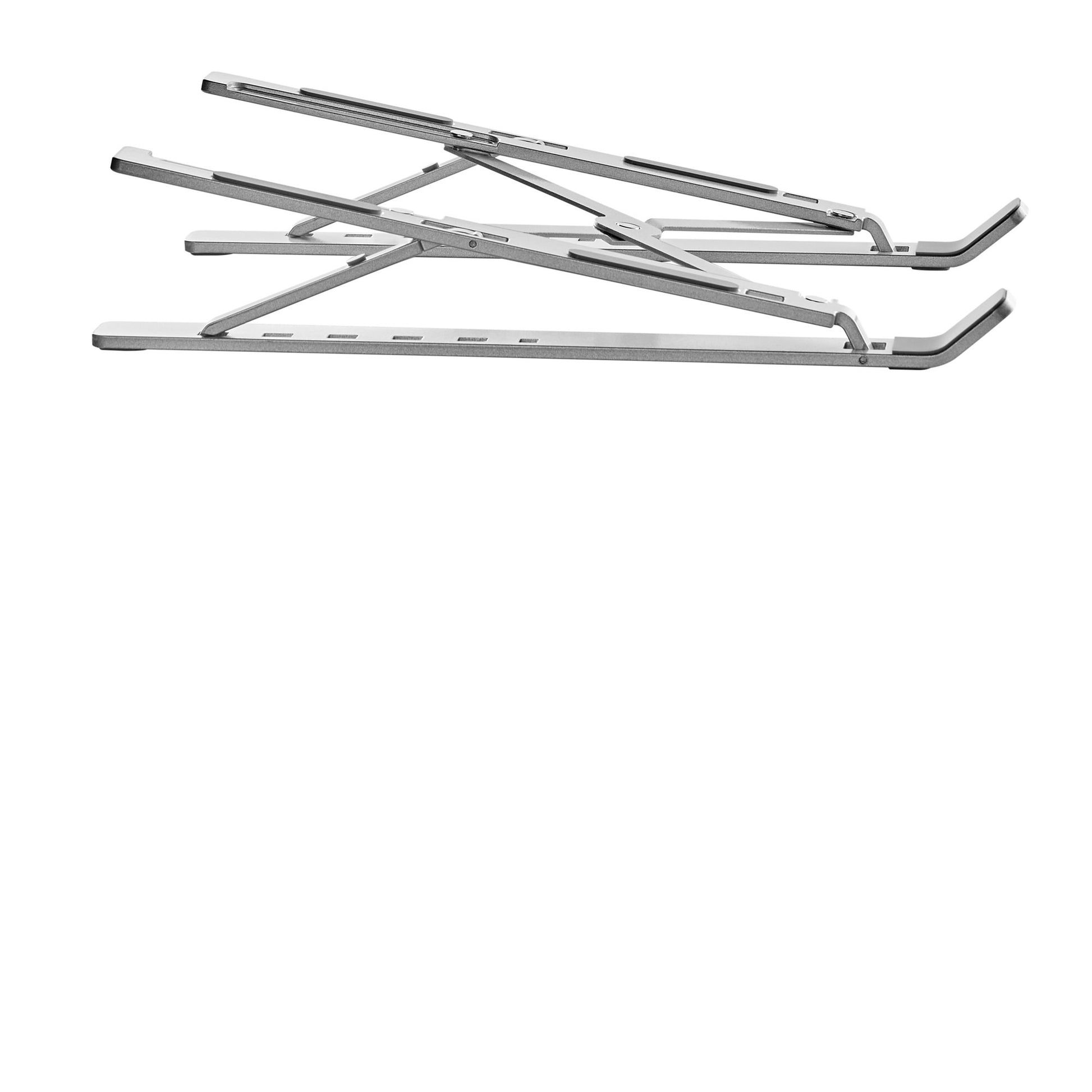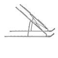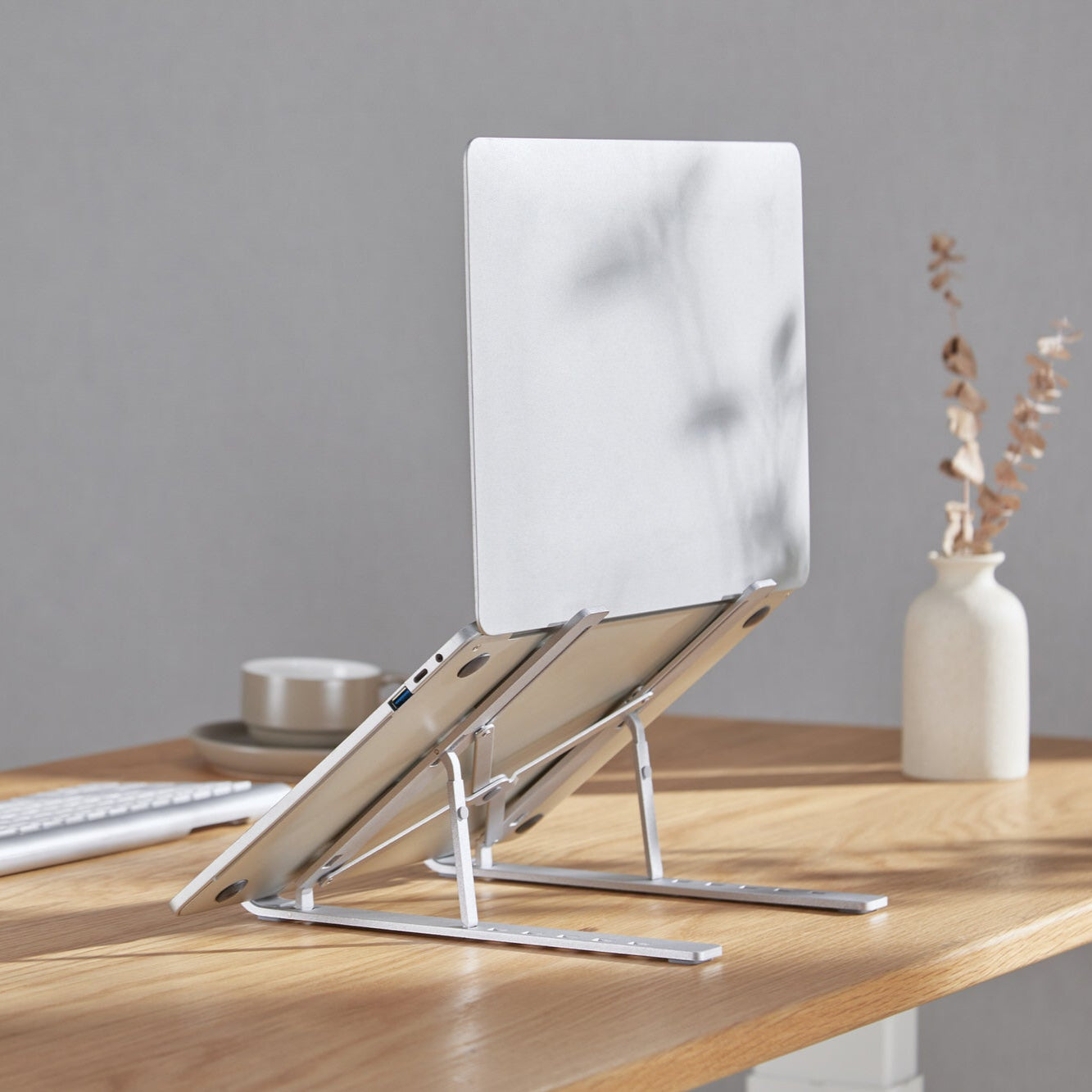 The stand features a folding mechanism which is fully collapsible for flat storage or transport. The open design ensures better airflow around your laptop.
